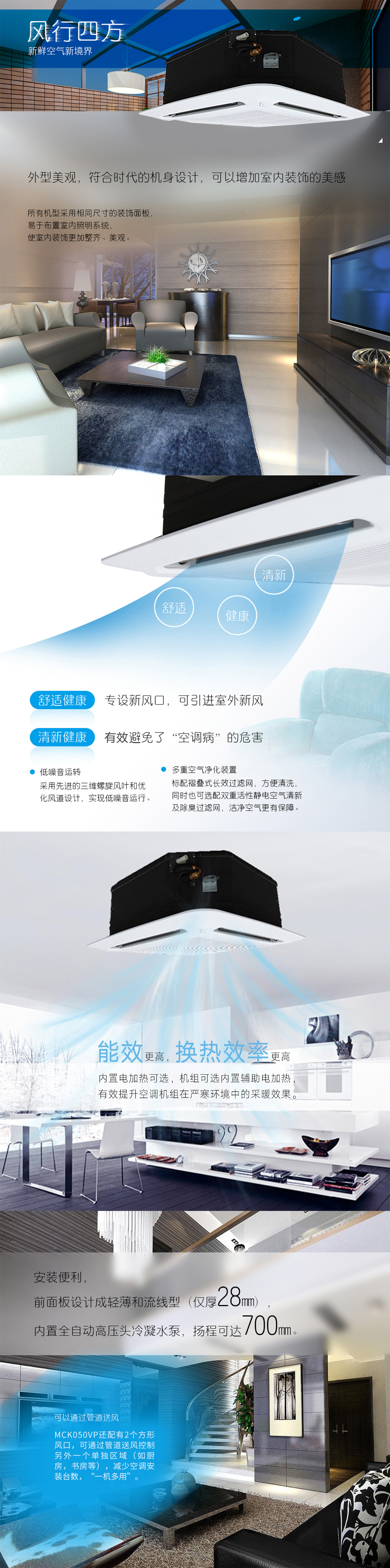 產(chǎn)品理念:新一代環(huán)保系列天花嵌入式空調(diào)機(jī)組,采用先進(jìn)的空調(diào)換氣設(shè)計,并通過多重降噪處理,集環(huán)保、節(jié)能、靜音、清新、舒適于一身,營造一個自然健康的生活環(huán)境,可時刻享受清新健康的空氣,擺脫“空調(diào)病”的危害。